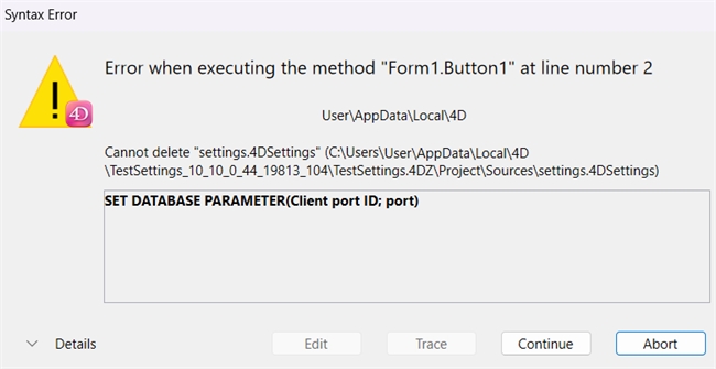 The Cannot delete "settings.4DSettings" Syntax Error is an error that can occur in project mode 4D from a remote client. The error can occur when calling the SET DATABASE PARAMETER command with a database parameter that applies to the remote client. The details of the error mention the full path of the settings.4DSettings file.