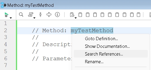 For example, if a variable is selected in the method editor, its definition and references can be searched. In the following image, with $myVar selected, the "Goto Definition..." option will jump to the line where the variable was defined.