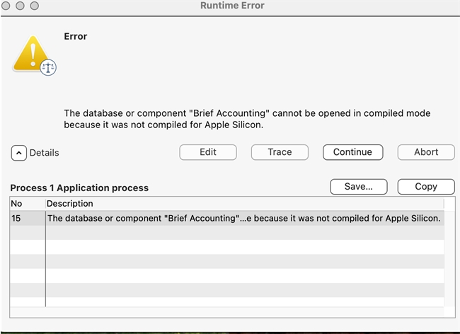 The database or component {application_name} cannot be opened in compiled mode because it was not compiled for Apple Silicon.