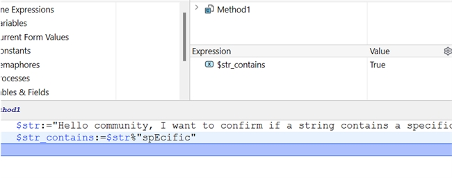 | $str:="Hello community, I want to confirm if a string contains a specific word. How can I do that?" $str_contains:=$str%"specific" |