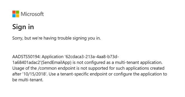 To fix this, either specify the tenant ID explicitly in the parameters or configure the app to be multi-tenant in Azure Portal.