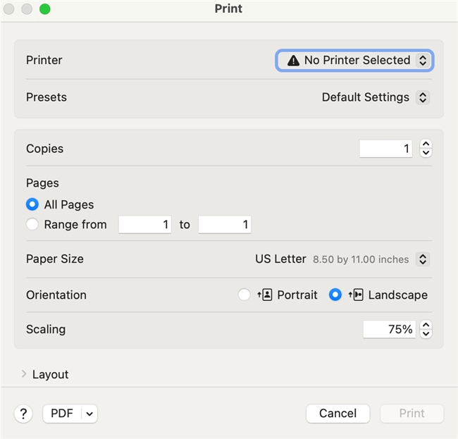 If the print dialog is opened, it can be seen for this specific scenario, that the issue is that there is no printer selected:
