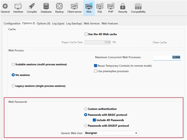 In the project settings, locate the Web Passwords configuration on Web Tab -> Options (I), change the type to “Custom authentication,” then save and restart the project.