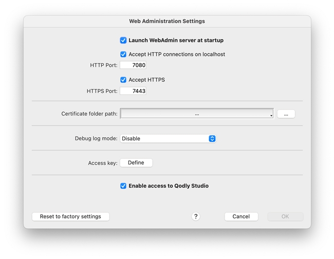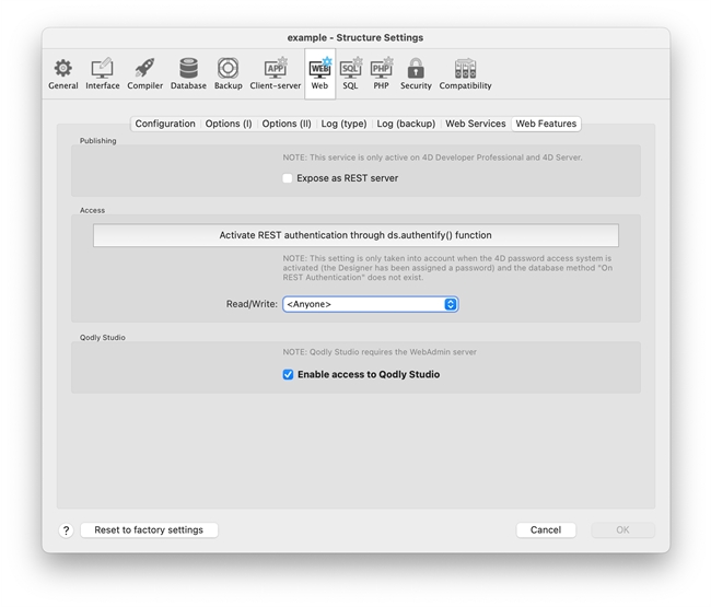 Check that the “Enable access to Qodly Studio” setting is enabled in the Structure Settings: