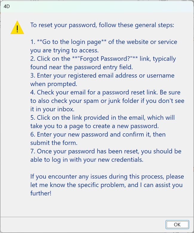 var $client:=cs.AIKit.OpenAI.new($apiKey) var $messages:=[] //New object command can be used as well $messages.push(New object("role"; "system"; "content"; "Act as a helpful support agent.")) $messages.push({role: "user"; content: "How can I reset my password?"}) var $result:=$client.chat.completions.create($messages; {model: "gpt-4o-mini"}) ALERT($result.choice.message.text) |