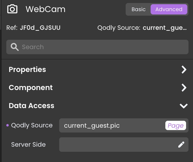 Finally, bind the Qodly source of the WebCam component to the picture field of the entity source.