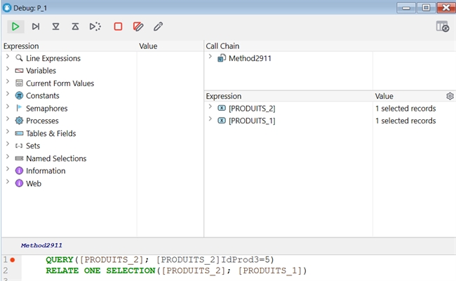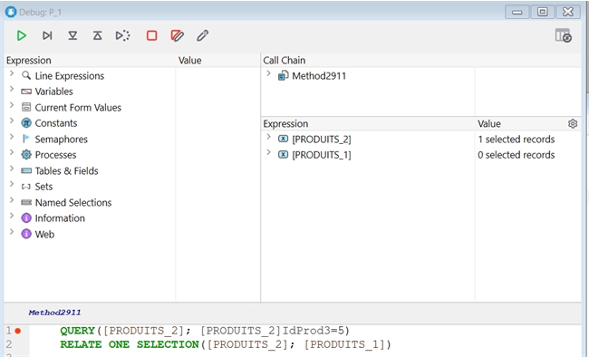 The command RELATE ONE SELECTION([PRODUITS_2]; [PRODUITS_1]) does not return the expected value from [PRODUITS_1]. As shown in the debugger, [PRODUITS_1] has 0 selected records, while [PRODUITS_2] has 1 selected record, which includes a valid value in the produit_1 field.