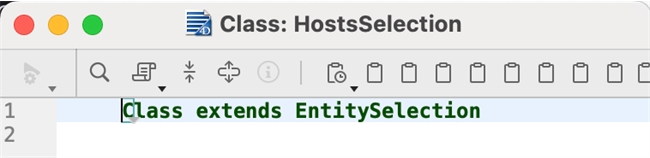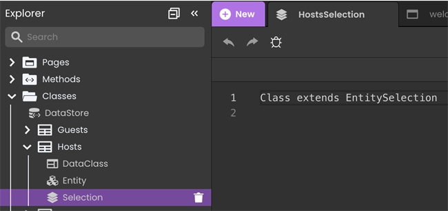 Data model classes allow developers to write functions that interface with dataclass, entity, and entity selection class objects. The traditional way to create a data model class is to create a new class in 4D and name it [DataClassName] (for DataClass class), and append “Entity” (for Entity class) or “Selection” (for EntitySelection class). For example, to create an EntitySelection class for a “Hosts” dataclass, name a new class “HostsSelection”.
