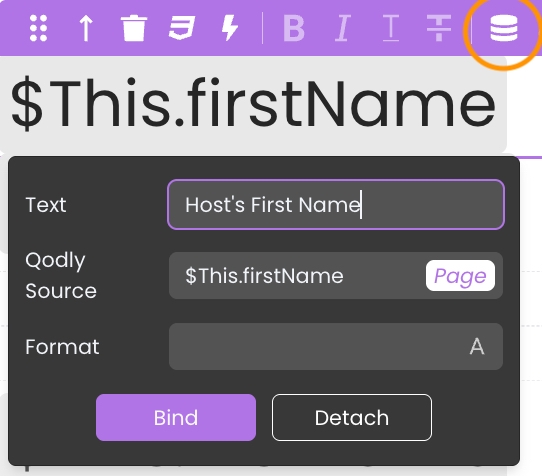 Then, update the “Text” field to the desired title and select Bind (not changing the Qodly Source field).