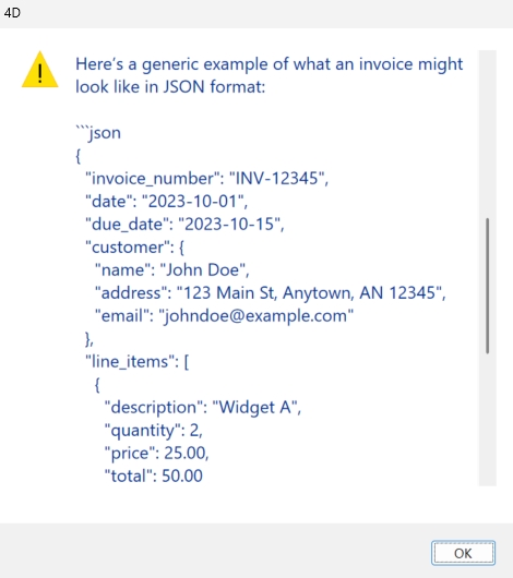 var $client : cs.AIKit.OpenAI var $file : Object var $messages : Collection var $result : Object $client:=cs.AIKit.OpenAI.new("sk-proj-xxx") // Upload PDF with assistants purpose var $preFile:=File("/Resources/invoice.pdf") $file:=$client.files.create($preFile; "assistants") // Build messages $messages:=New collection $messages.push({\ role: "user";\ content: "Extract invoice data as JSON";\ attachments: [$file.id]}) // Execute request $result:=$client.chat.completions.create($messages) If ($result.success) ALERT($result.choice.message.content) End if |