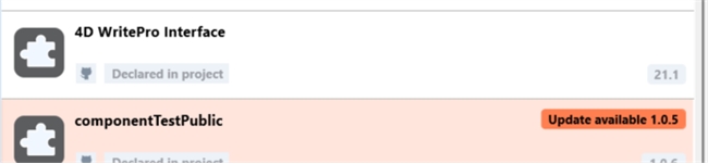 If a newer version of a component is detected, 4D displays a notification indicating that an update is available. However, if this notification is overlooked and the database is later restarted while automatic updates are enabled, the new component version will be installed automatically and without any additional confirmation.