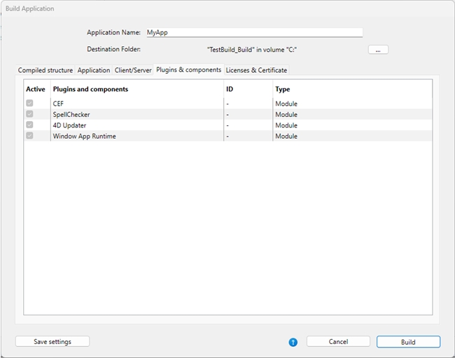 If your application does not use features that rely on Fluent UI, you can deselect the Windows App Runtime module in the Build Application → Plugins and components list to reduce the size of the built application.