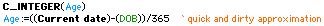Age:=Year of(Current date)-Year of(DOB) ` nominal age